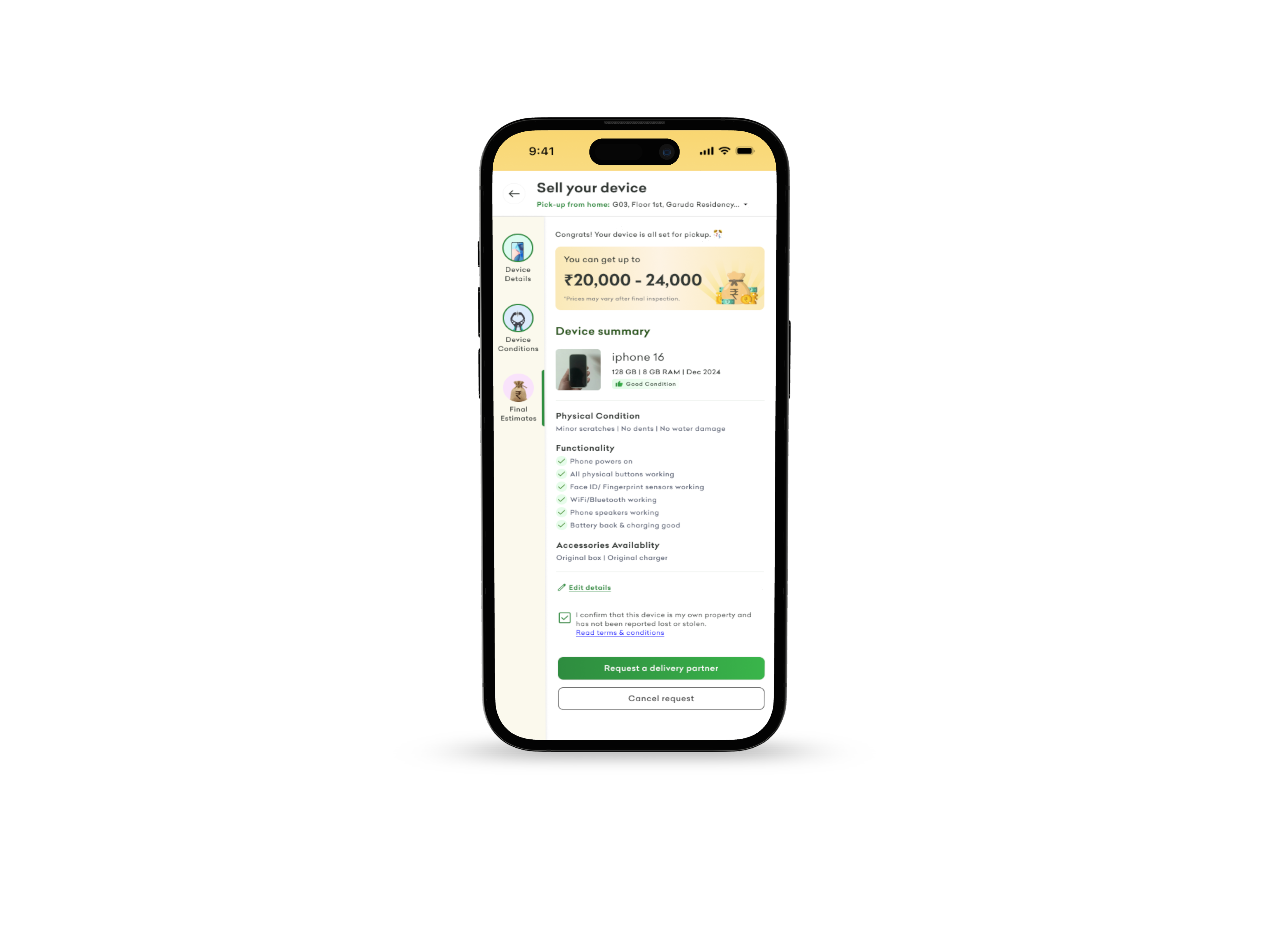 A Blinkit rider picks up your phone just like any delivery — verified & insured.