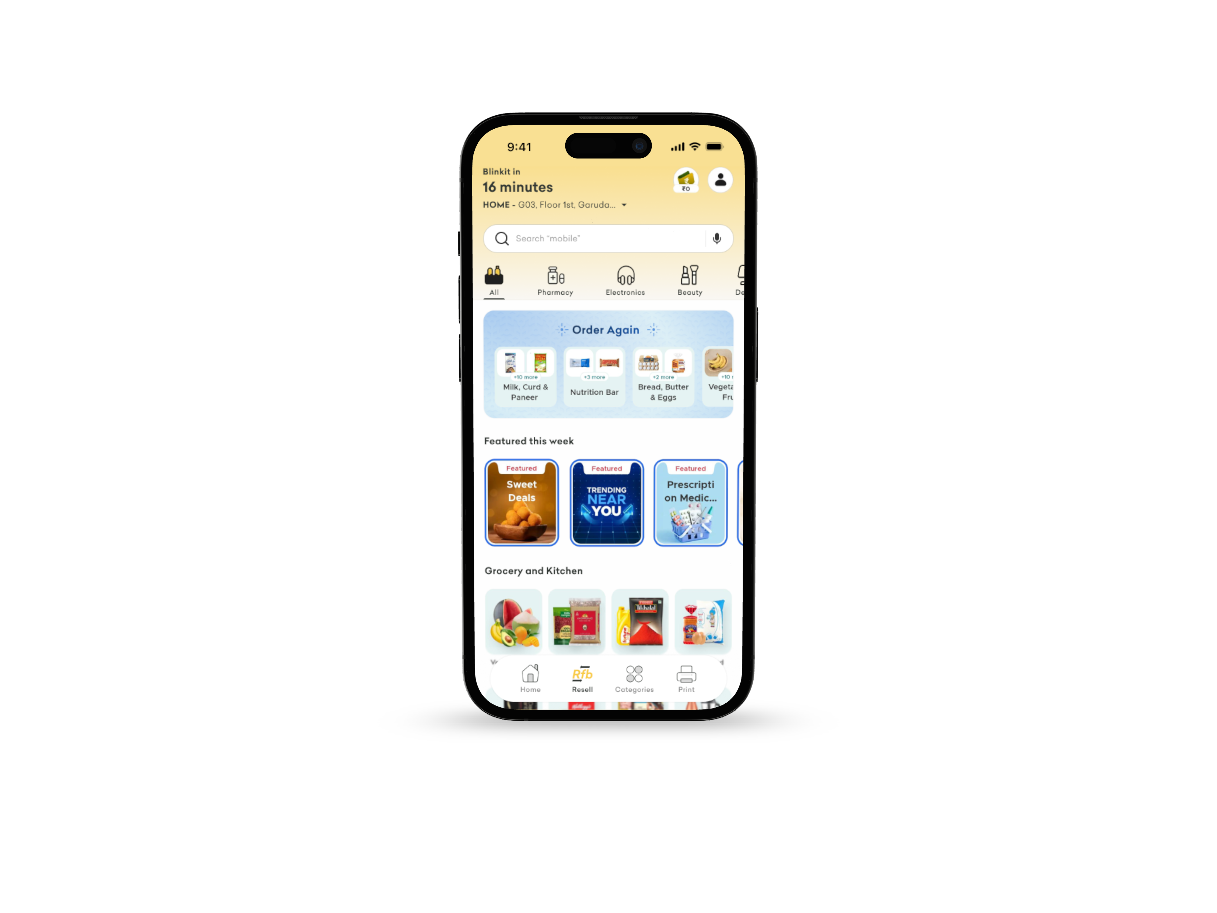 Blinkit's existing nav already has a "Print" tab, proving the pattern accepts new high-intent actions. Resell has far higher utility frequency than Print — it earns its spot.
